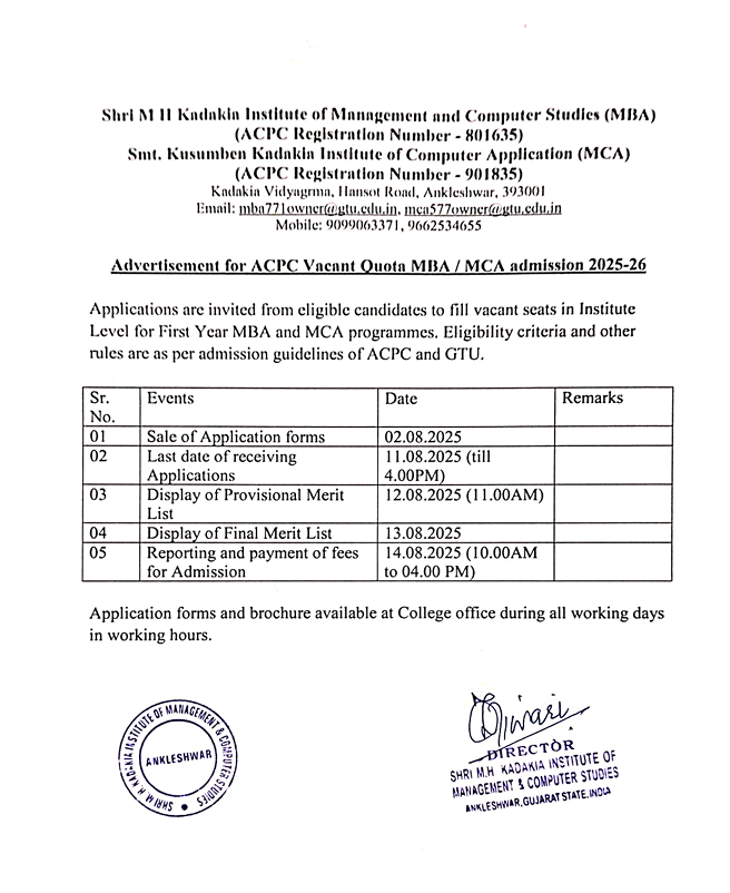 Institute Development Plan (IDP) Name of Institute: – Shri M. H. Kadakia Institute of Management and Computer Studies, Ankleshwar (MBA Program) Smt. Kusumben Kadakia Institute of Computer Application, Ankleshwar (MCA Program) Address: – Kadakia Educational campus, Hansot Road Ankleshwar 393001. Duration: –2025 to 2030 Date of Submission: 15/02/2026 Table of